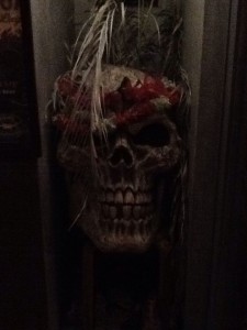 入口に巨大な骸骨の置物がある店で、ハワイアンバー。